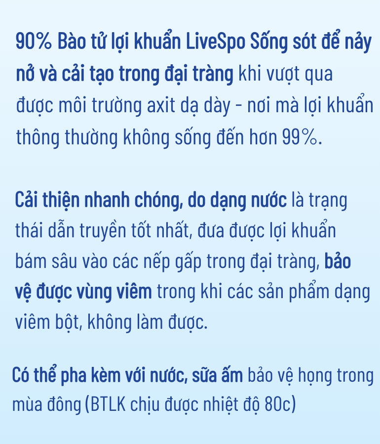 - Bổ sung bào tử lợi khuẩn giúp cân bằng hệ vi sinh đường ruột, giúp hỗ trợ tiêu hóa.